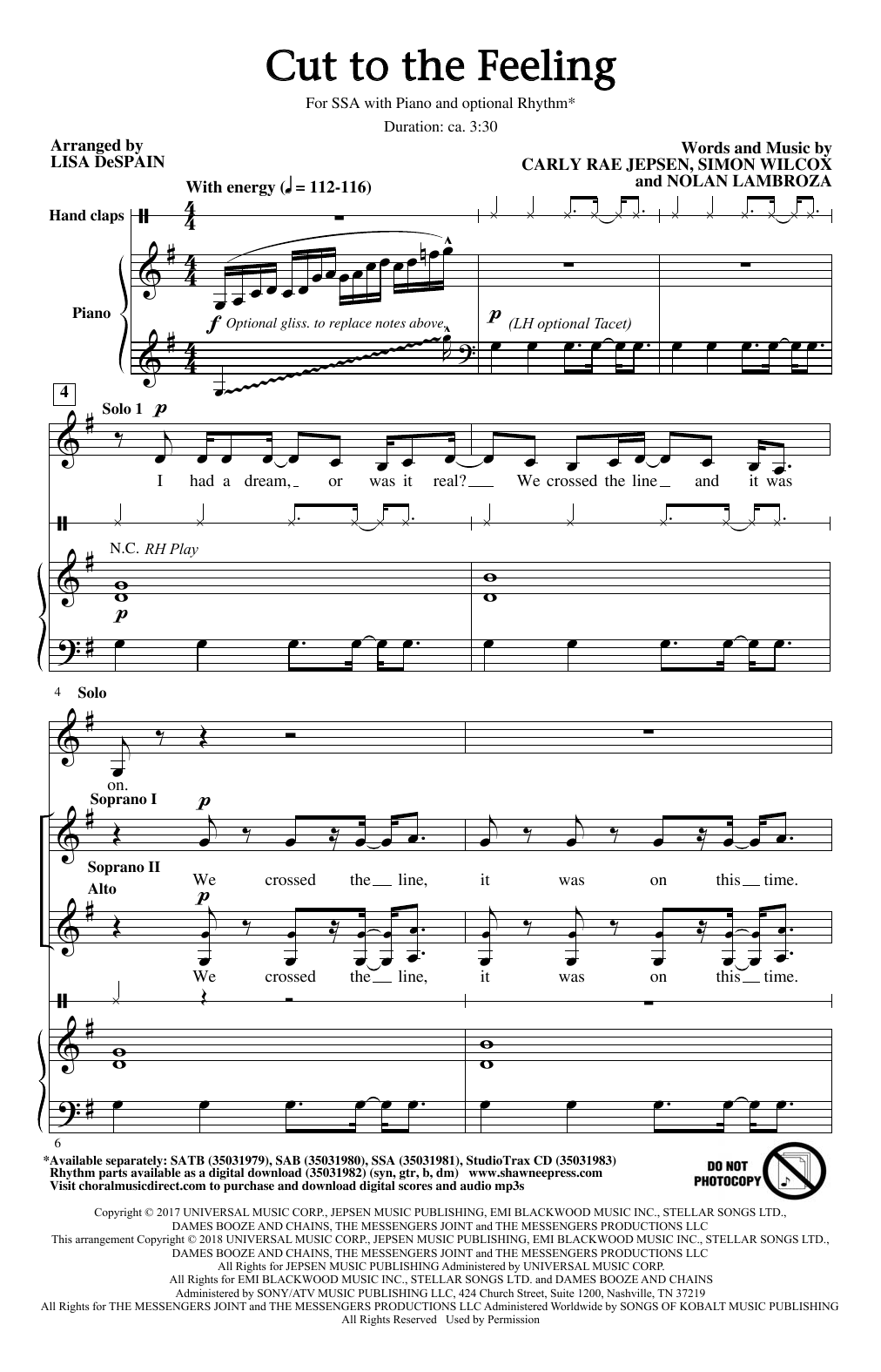 Download or print Lisa DeSpain Cut To The Feeling sheet music, chords and digital score arranged for SSA Choir. This Pop score includes 18 page(s).