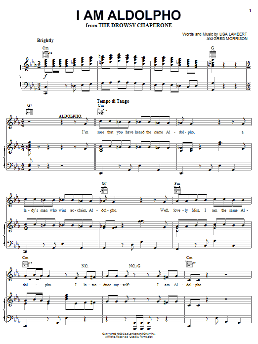Download or print Lisa Lambert I Am Aldolpho sheet music, chords and digital score arranged for Piano & Vocal. This Musical/Show score includes 4 page(s).