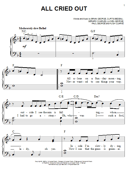Download or print Lisa Lisa & Cult Jam All Cried Out sheet music, chords and digital score arranged for Easy Piano. This Rock score includes 5 page(s).