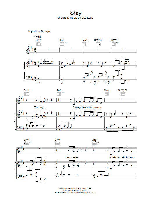 Download or print Lisa Loeb Stay (I Missed You) sheet music, chords and digital score arranged for Piano, Vocal & Guitar Chords (Right-Hand Melody). This Pop score includes 7 page(s).