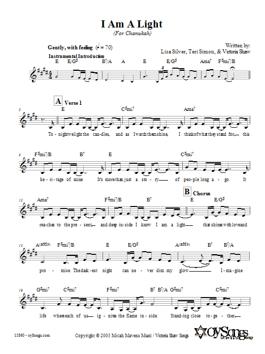 Download or print Lisa Silver I Am A Light (For Chanukah) sheet music, chords and digital score arranged for Lead Sheet / Fake Book. This Traditional score includes 3 page(s).