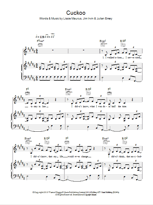 Download or print Lissie Cuckoo sheet music, chords and digital score arranged for Piano, Vocal & Guitar Chords. This Pop score includes 7 page(s).