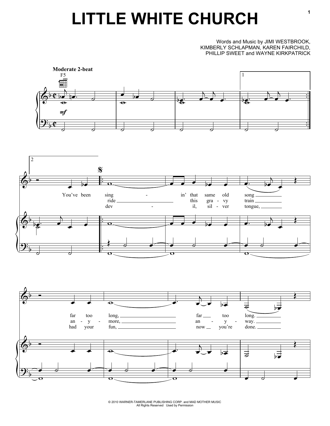 Download or print Little Big Town Little White Church sheet music, chords and digital score arranged for Piano, Vocal & Guitar Chords (Right-Hand Melody). This Country score includes 7 page(s).