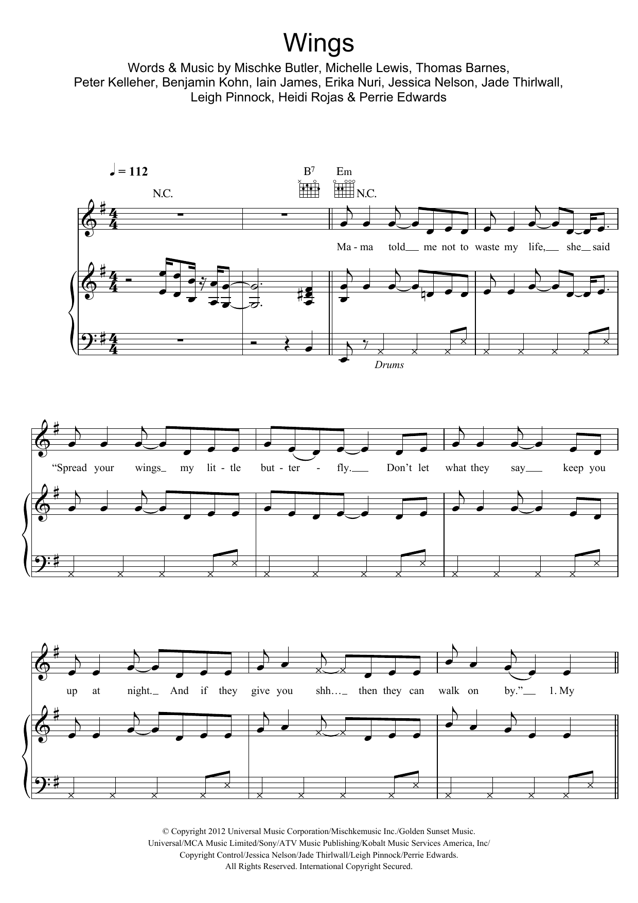Download or print Little Mix Wings sheet music, chords and digital score arranged for Piano Chords/Lyrics. This Pop score includes 2 page(s).