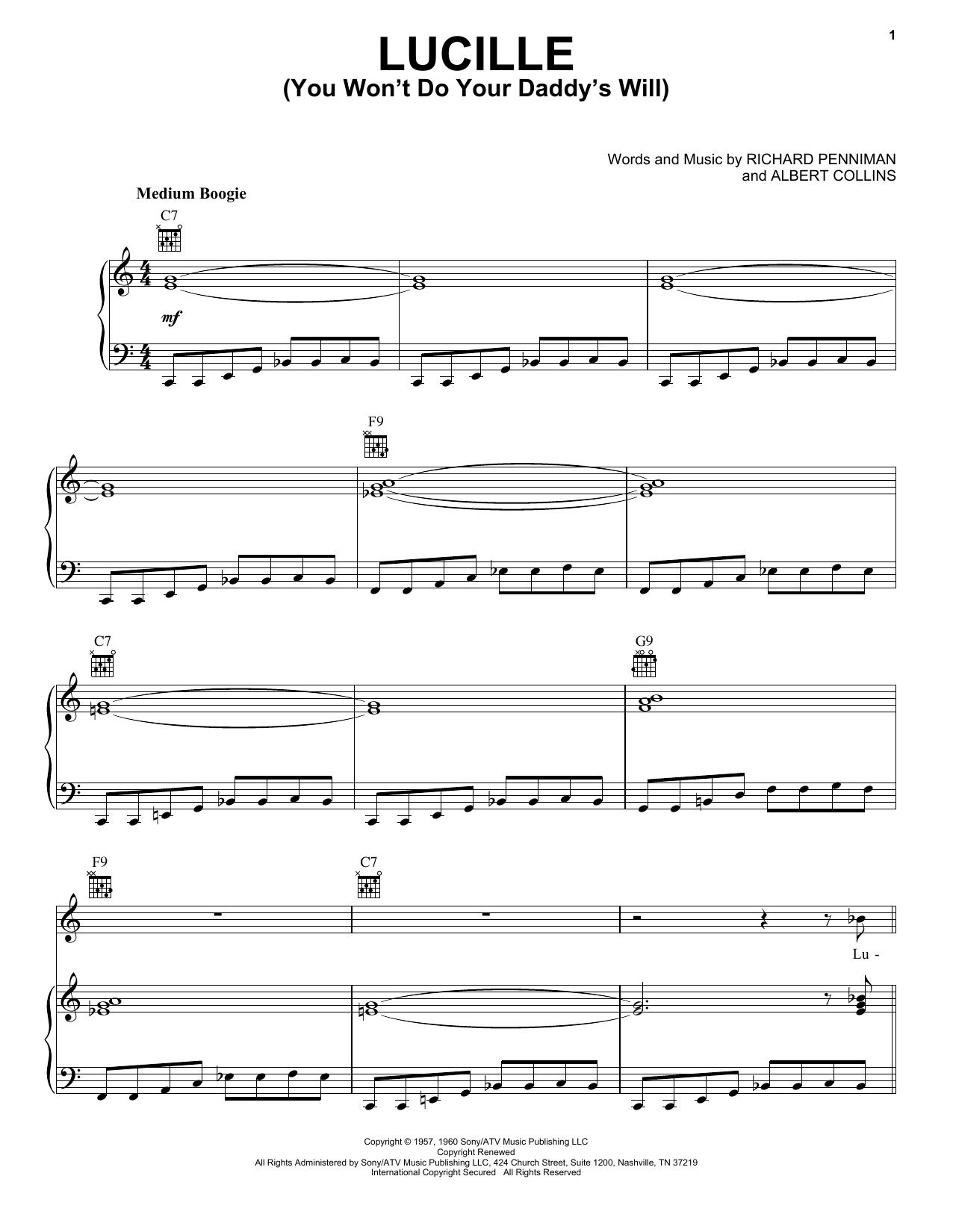 Download or print Little Richard Lucille (You Won't Do Your Daddy's Will) sheet music, chords and digital score arranged for Piano, Vocal & Guitar Chords (Right-Hand Melody). This Oldies score includes 4 page(s).