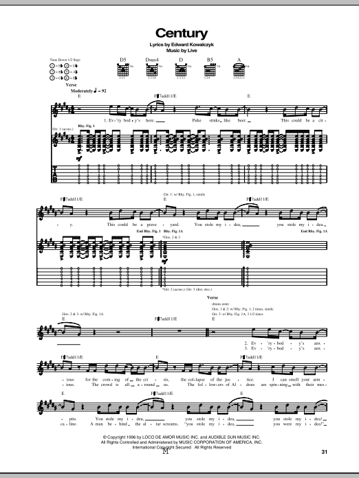 Download or print Live Century sheet music, chords and digital score arranged for Guitar Tab. This Pop score includes 6 page(s).