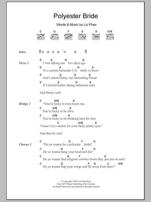 Download or print Liz Phair Polyester Bride sheet music, chords and digital score arranged for Guitar Chords/Lyrics. This Rock score includes 3 page(s).