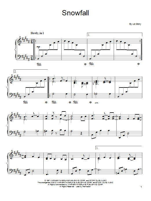 Download or print Liz Story Snowfall sheet music, chords and digital score arranged for Piano Solo. This Holiday score includes 6 page(s).