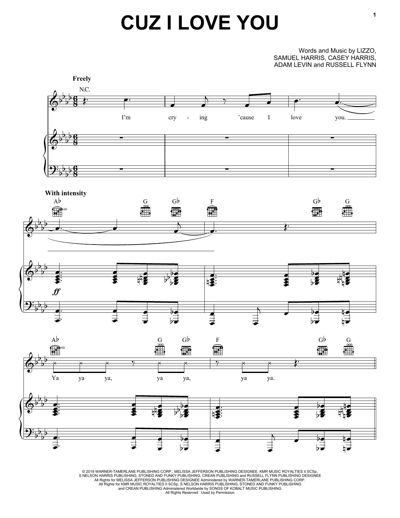 Download or print Lizzo Cuz I Love You sheet music, chords and digital score arranged for Piano, Vocal & Guitar Chords (Right-Hand Melody). This Pop score includes 6 page(s).
