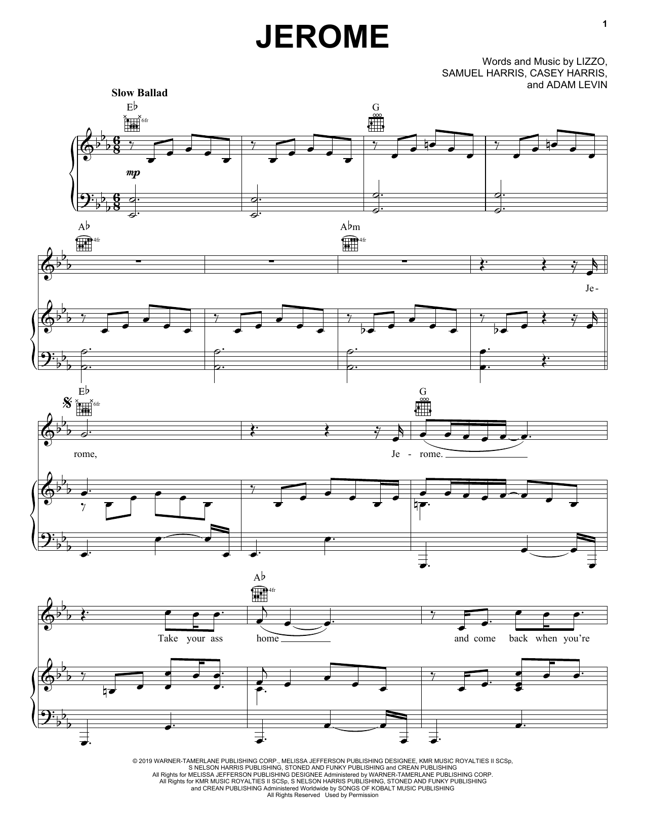Download or print Lizzo Jerome sheet music, chords and digital score arranged for Piano, Vocal & Guitar Chords (Right-Hand Melody). This Pop score includes 7 page(s).