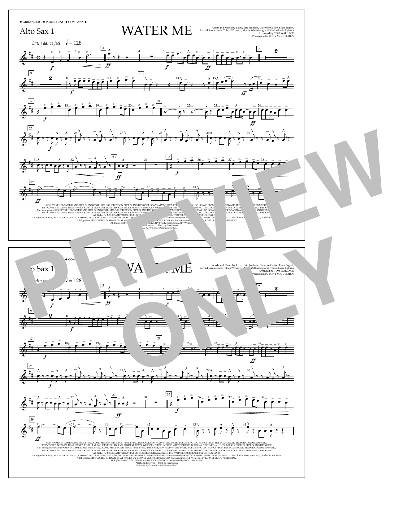 Download or print Lizzo Water Me (arr. Tom Wallace) - Alto Sax 1 sheet music, chords and digital score arranged for Marching Band. This Pop score includes 1 page(s).