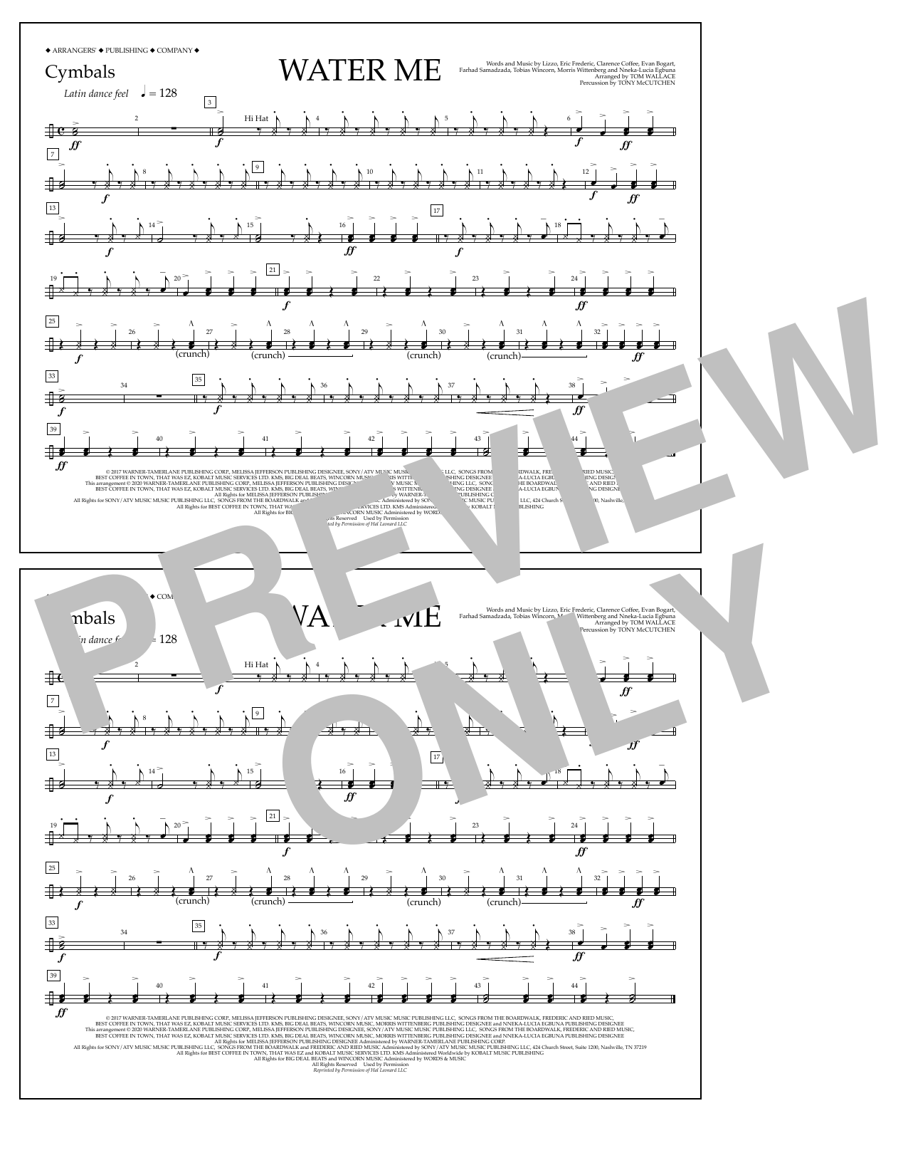 Download or print Lizzo Water Me (arr. Tom Wallace) - Cymbals sheet music, chords and digital score arranged for Marching Band. This Pop score includes 1 page(s).