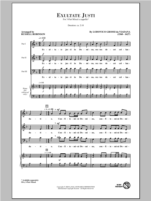 Download or print Russell Robinson Exultate Justi sheet music, chords and digital score arranged for 3-Part Mixed Choir. This Concert score includes 7 page(s).