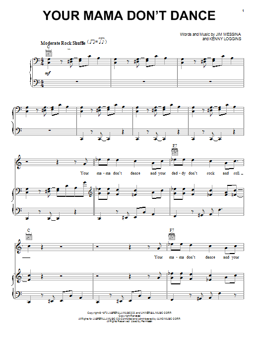 Download or print Loggins And Messina Your Mama Don't Dance sheet music, chords and digital score arranged for Lead Sheet / Fake Book. This Pop score includes 2 page(s).