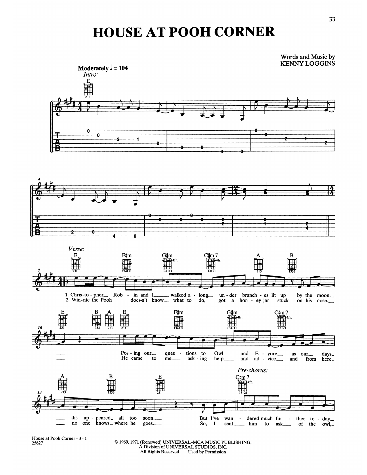 Download or print Loggins & Messina House At Pooh Corner sheet music, chords and digital score arranged for Piano, Vocal & Guitar Chords (Right-Hand Melody). This Children score includes 5 page(s).