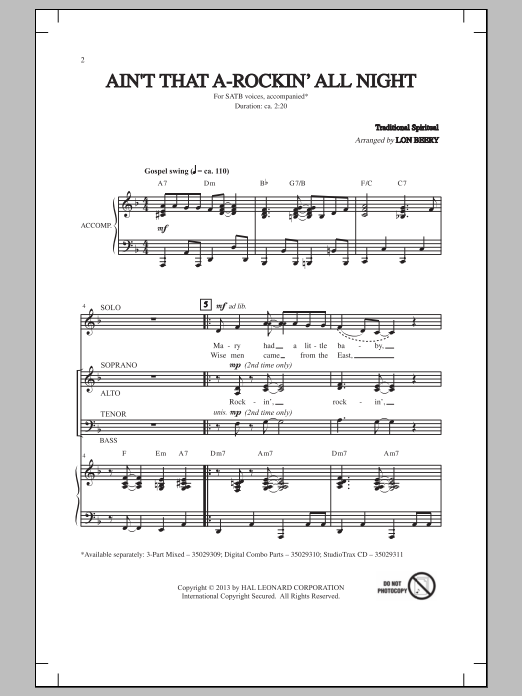 Download or print Lon Beery Ain't That A-Rockin' All Night sheet music, chords and digital score arranged for 3-Part Mixed Choir. This Concert score includes 11 page(s).