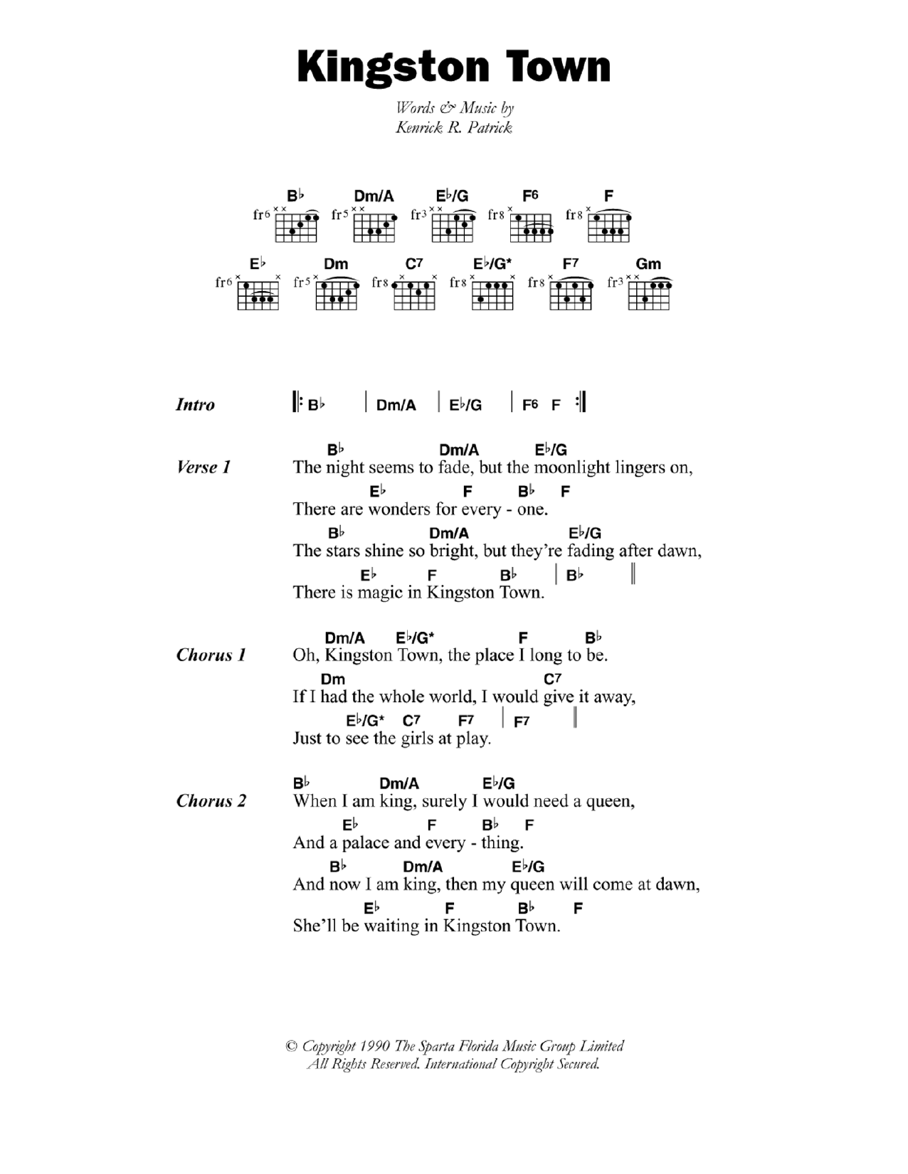 Download or print Lord Creator Kingston Town sheet music, chords and digital score arranged for Guitar Chords/Lyrics. This Reggae score includes 2 page(s).