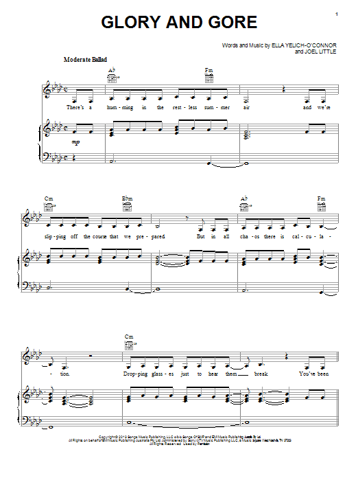 Download or print Lorde Glory And Gore sheet music, chords and digital score arranged for Piano, Vocal & Guitar Chords (Right-Hand Melody). This Pop score includes 7 page(s).