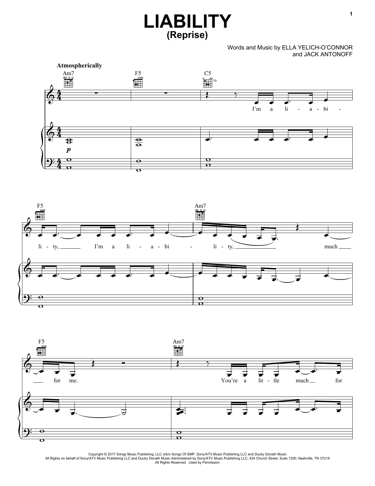 Download or print Lorde Liability (Reprise) sheet music, chords and digital score arranged for Piano, Vocal & Guitar Chords (Right-Hand Melody). This Pop score includes 4 page(s).