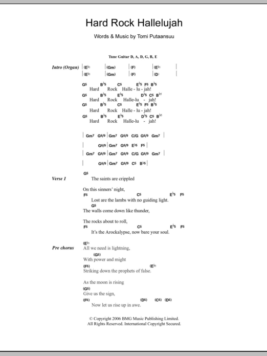 Download or print Lordi Hard Rock Hallelujah sheet music, chords and digital score arranged for Guitar Chords/Lyrics. This Rock score includes 3 page(s).