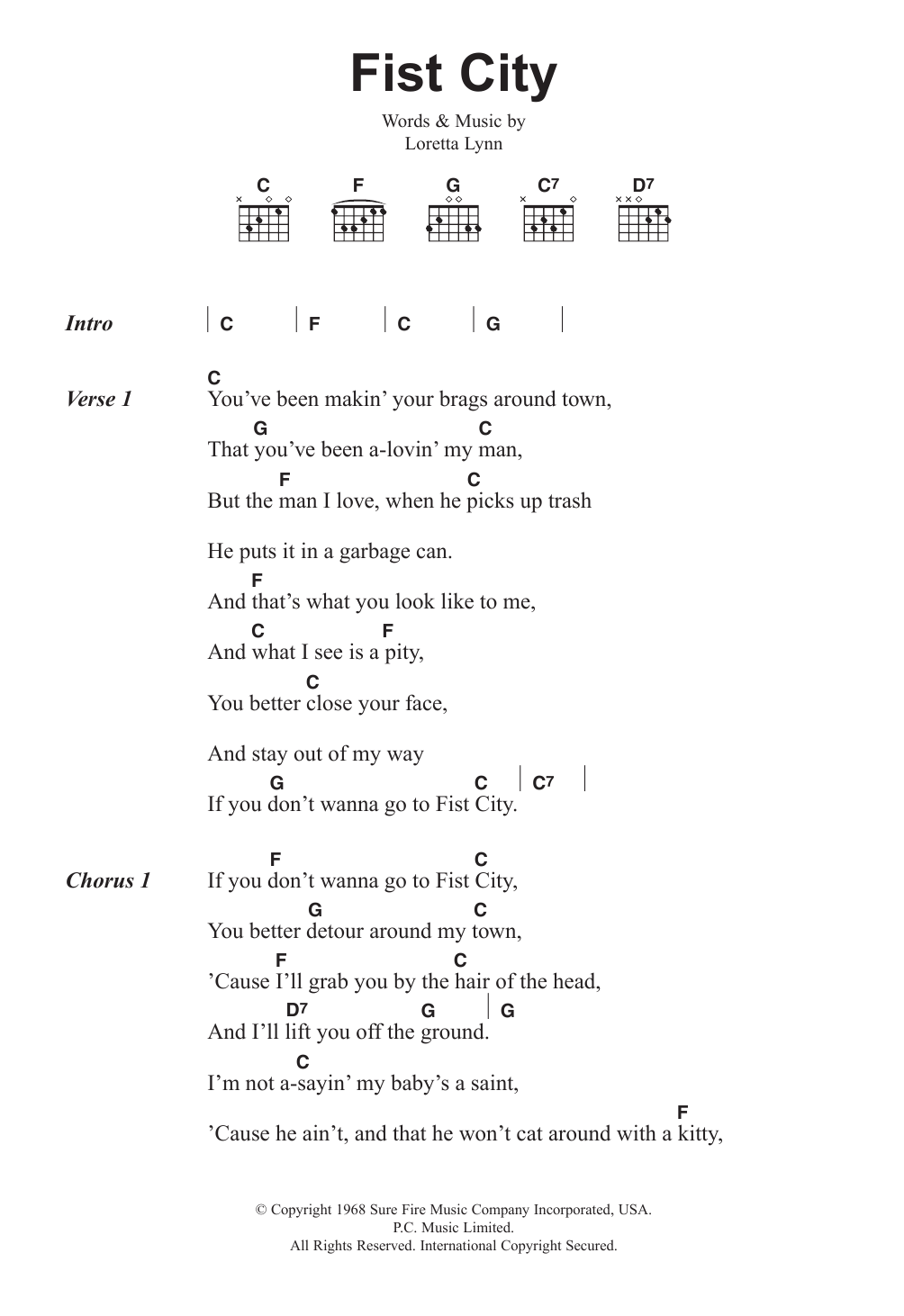 Download or print Loretta Lynn Fist City sheet music, chords and digital score arranged for Guitar Chords/Lyrics. This Country score includes 2 page(s).