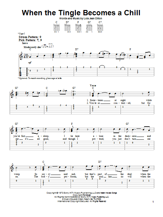Download or print Loretta Lynn When The Tingle Becomes A Chill sheet music, chords and digital score arranged for Piano, Vocal & Guitar Chords (Right-Hand Melody). This Country score includes 2 page(s).