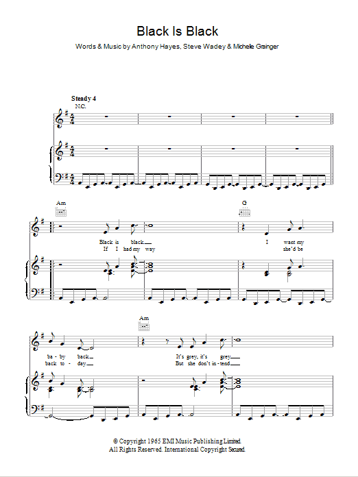 Download or print Los Bravos Black Is Black sheet music, chords and digital score arranged for Piano, Vocal & Guitar Chords. This Latin score includes 4 page(s).