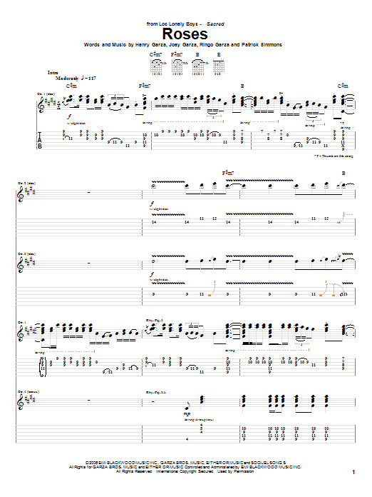 Download or print Los Lonely Boys Roses sheet music, chords and digital score arranged for Guitar Tab. This Pop score includes 12 page(s).