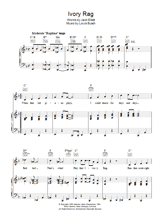 Download or print Lou Busch Ivory Rag sheet music, chords and digital score arranged for Piano, Vocal & Guitar Chords. This Jazz score includes 3 page(s).