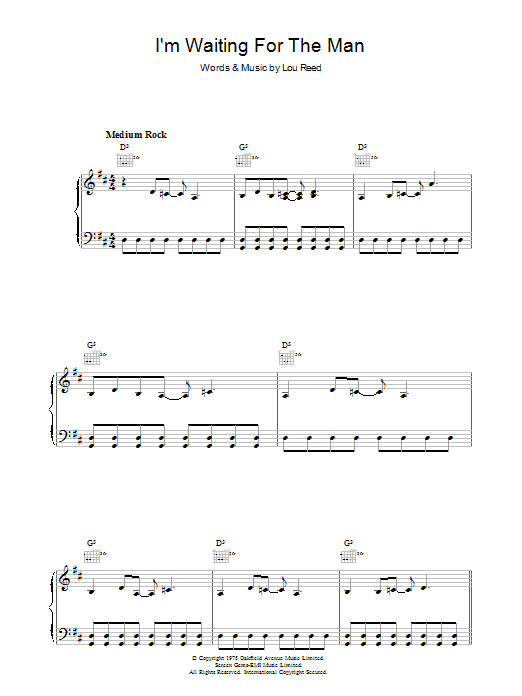 Download or print Lou Reed I'm Waiting For The Man sheet music, chords and digital score arranged for Piano, Vocal & Guitar Chords. This Rock score includes 6 page(s).