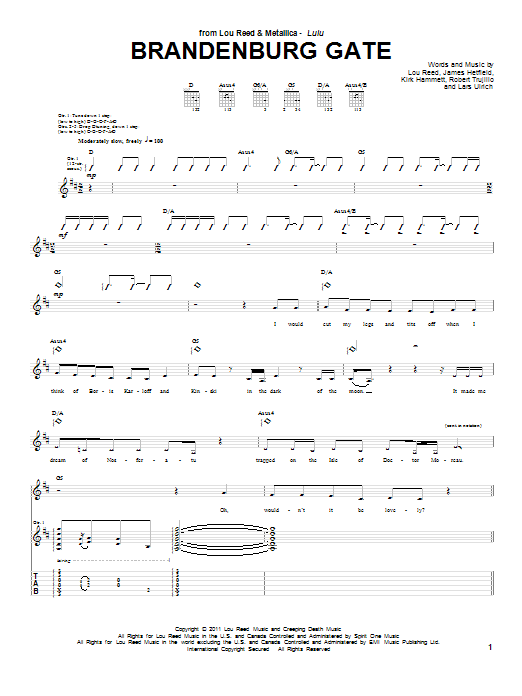 Download or print Lou Reed & Metallica Brandenburg Gate sheet music, chords and digital score arranged for Guitar Tab. This Pop score includes 7 page(s).