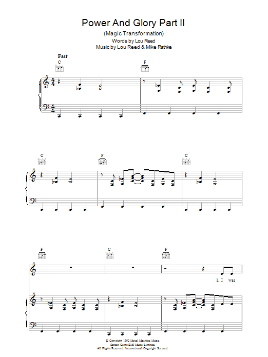 Download or print Lou Reed Power And Glory Part 2 sheet music, chords and digital score arranged for Piano, Vocal & Guitar Chords. This Rock score includes 5 page(s).
