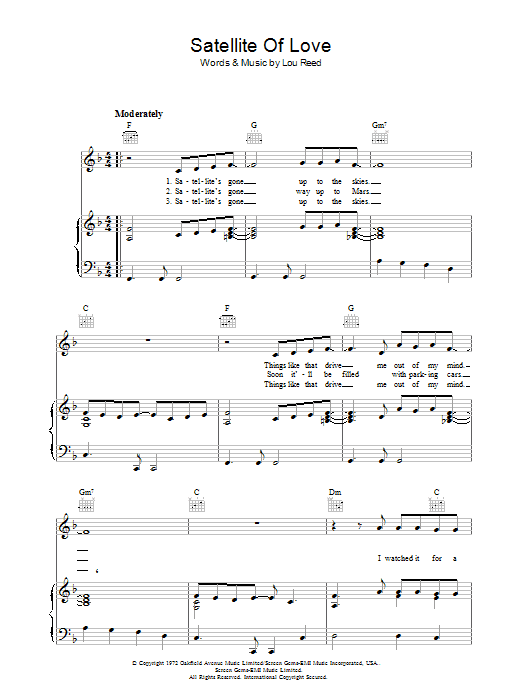 Download or print Lou Reed Satellite Of Love sheet music, chords and digital score arranged for Guitar Chords/Lyrics. This Rock score includes 2 page(s).