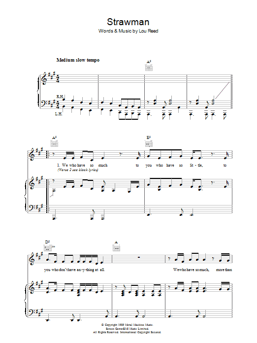 Download or print Lou Reed Strawman sheet music, chords and digital score arranged for Piano, Vocal & Guitar Chords. This Rock score includes 5 page(s).