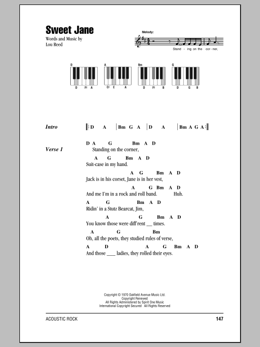 Download or print Lou Reed Sweet Jane (Intro) sheet music, chords and digital score arranged for Lead Sheet / Fake Book. This Pop score includes 4 page(s).