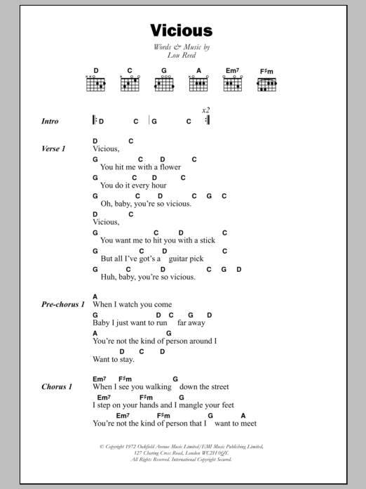Download or print Lou Reed Vicious sheet music, chords and digital score arranged for Guitar Chords/Lyrics. This Rock score includes 3 page(s).