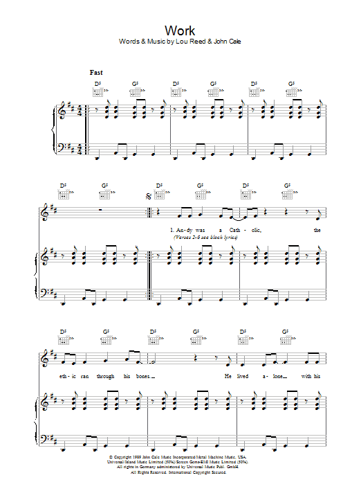 Download or print Lou Reed Work sheet music, chords and digital score arranged for Piano, Vocal & Guitar Chords. This Rock score includes 6 page(s).