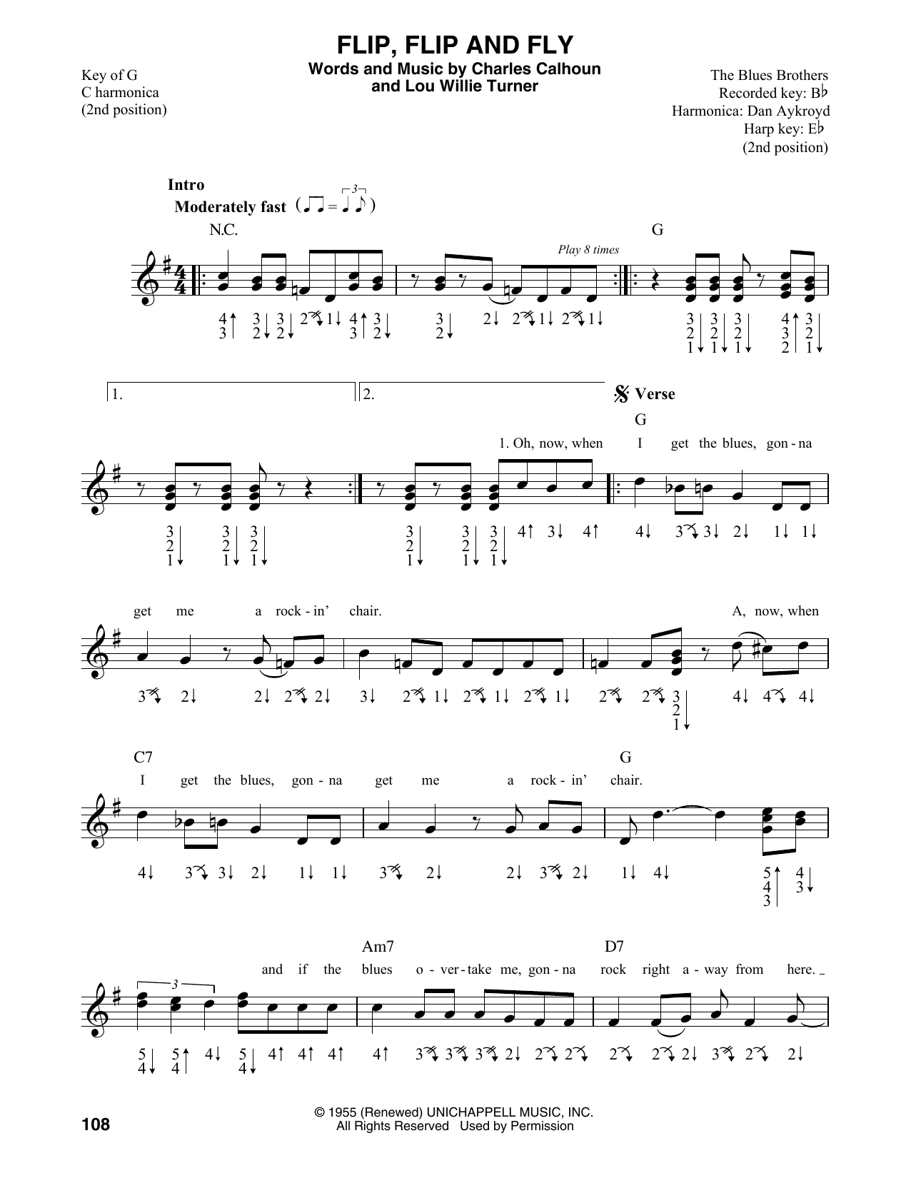 Download or print Lou Willie Turner Flip, Flop And Fly sheet music, chords and digital score arranged for Harmonica. This Blues score includes 2 page(s).