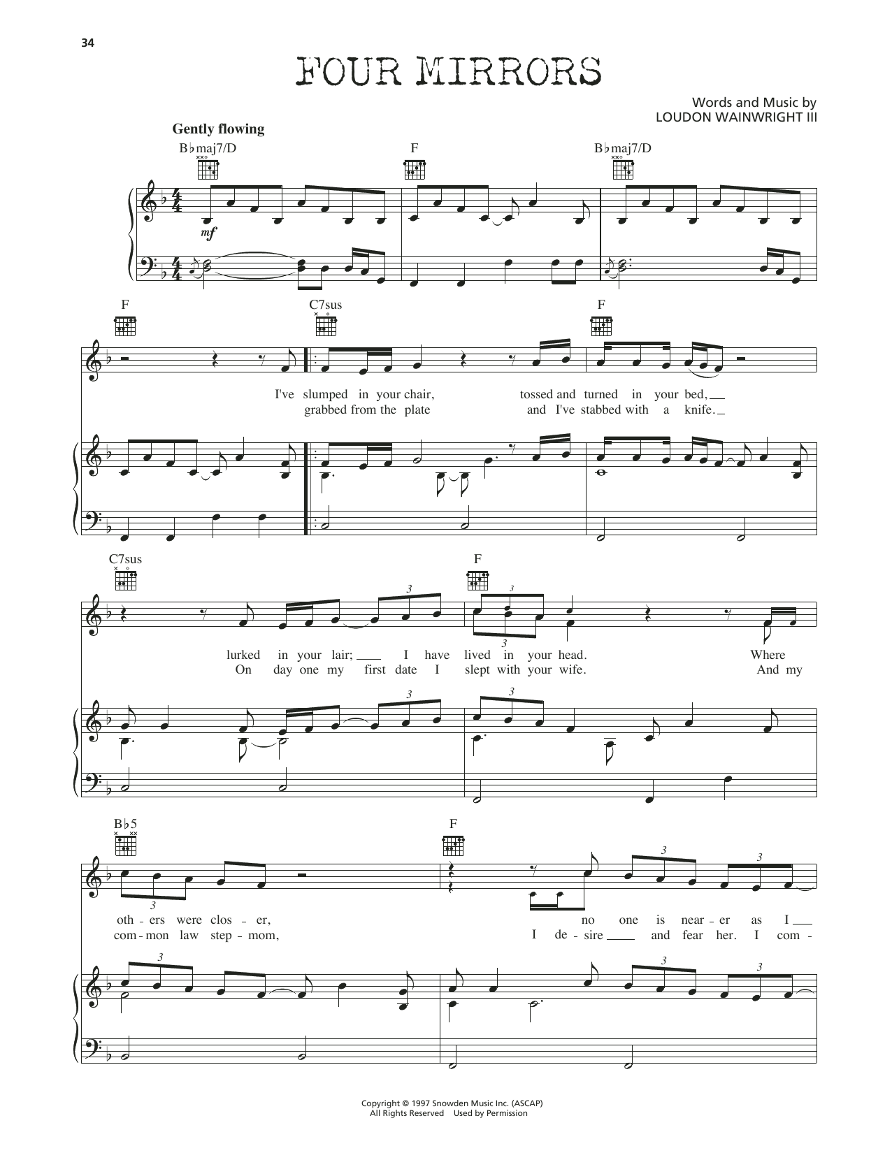 Download or print Loudon Wainwright III Four Mirrors sheet music, chords and digital score arranged for Piano, Vocal & Guitar Chords (Right-Hand Melody). This Folk score includes 4 page(s).