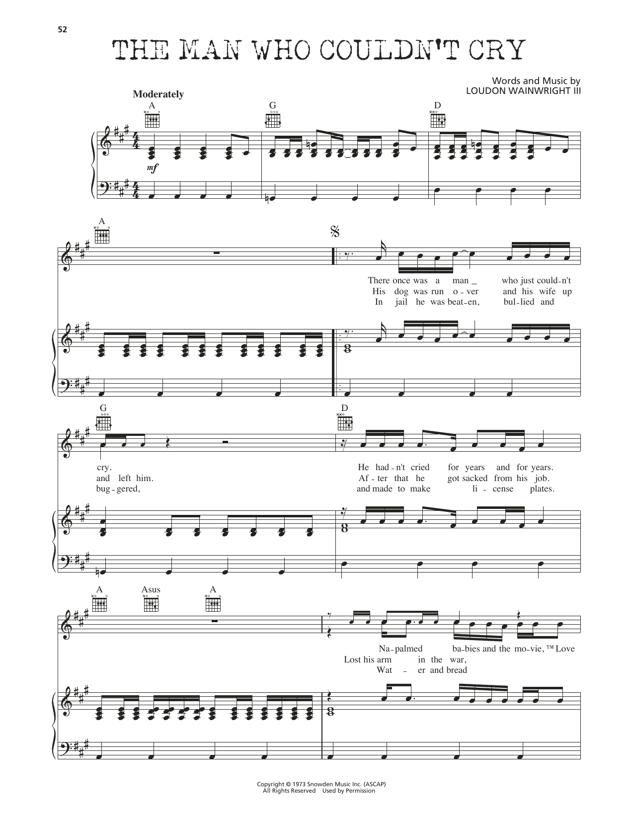 Download or print Loudon Wainwright III The Man Who Couldn't Cry sheet music, chords and digital score arranged for Piano, Vocal & Guitar Chords (Right-Hand Melody). This Folk score includes 6 page(s).