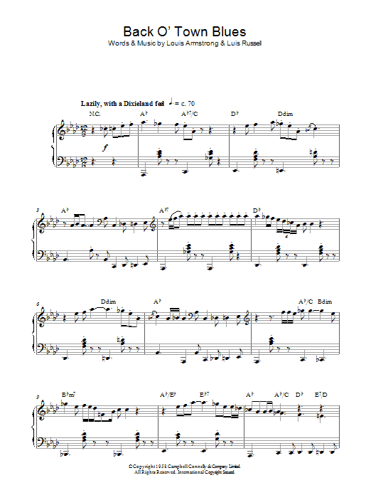 Download or print Louis Armstrong Back O' Town Blues sheet music, chords and digital score arranged for Piano Solo. This Blues score includes 4 page(s).
