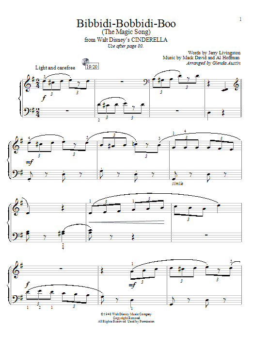 Download or print Verna Felton Bibbidi-Bobbidi-Boo (The Magic Song) (from Cinderella) (arr. Glenda Austin) sheet music, chords and digital score arranged for Educational Piano. This Children score includes 3 page(s).