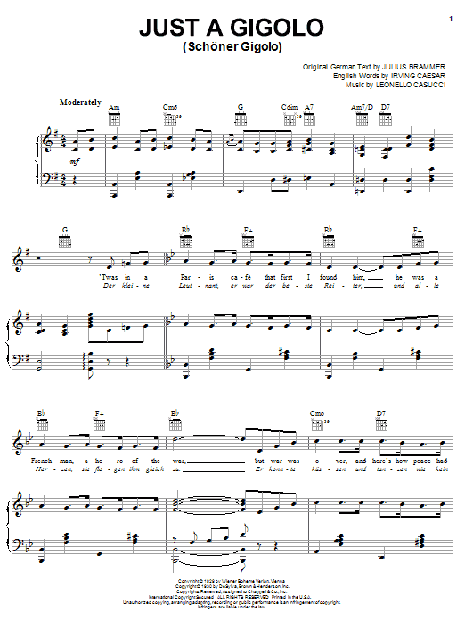 Download or print Louis Armstrong Just A Gigolo sheet music, chords and digital score arranged for Real Book – Melody & Chords – C Instruments. This Jazz score includes 1 page(s).
