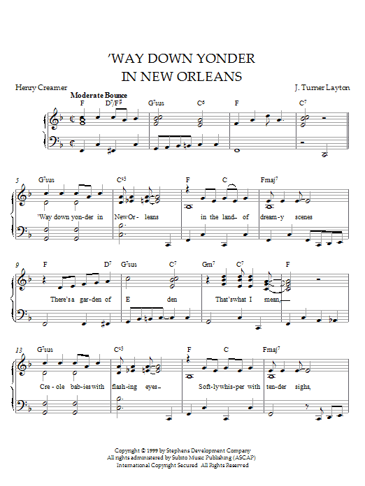 Download or print Henry Creamer and Turner Layton 'Way Down Yonder In New Orleans sheet music, chords and digital score arranged for Piano Solo. This Pop score includes 2 page(s).