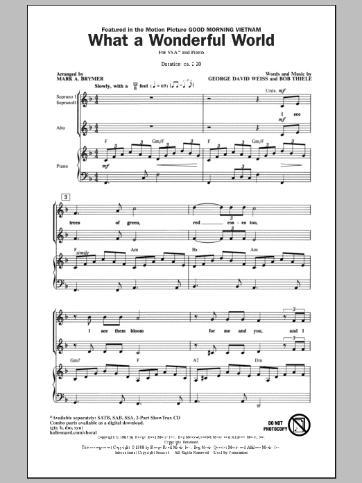 Download or print Louis Armstrong What A Wonderful World (arr. Mark Brymer) sheet music, chords and digital score arranged for SSA Choir. This Inspirational score includes 7 page(s).