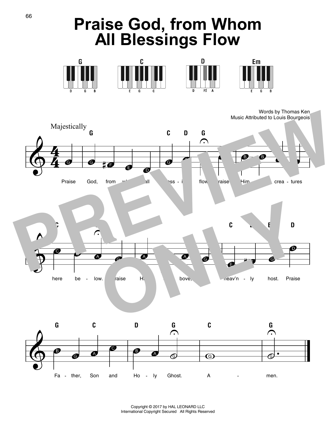 Download or print Louis Bourgeois Praise God, From Whom All Blessings Flow sheet music, chords and digital score arranged for Easy Piano. This Hymn score includes 1 page(s).