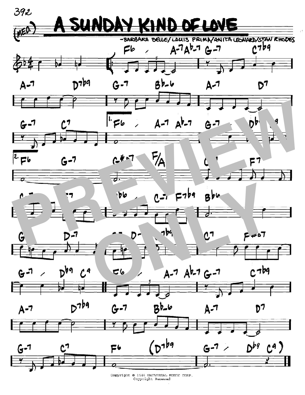 Download or print Louis Prima A Sunday Kind Of Love sheet music, chords and digital score arranged for Real Book – Melody & Chords – C Instruments. This Jazz score includes 1 page(s).
