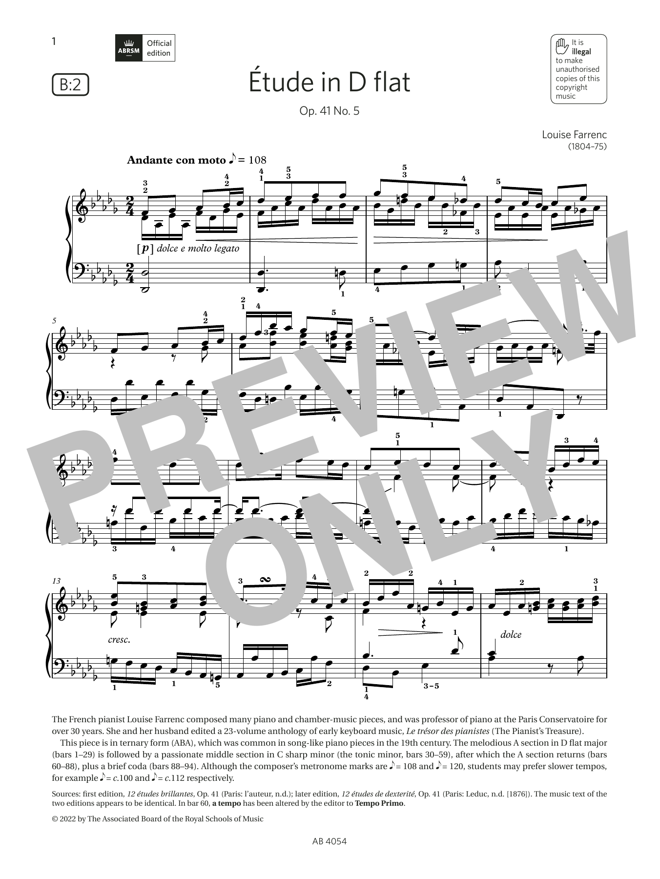 Download or print Louise Farrenc Étude in D flat (Grade 8, list B2, from the ABRSM Piano Syllabus 2023 & 2024) sheet music, chords and digital score arranged for Piano Solo. This Classical score includes 5 page(s).