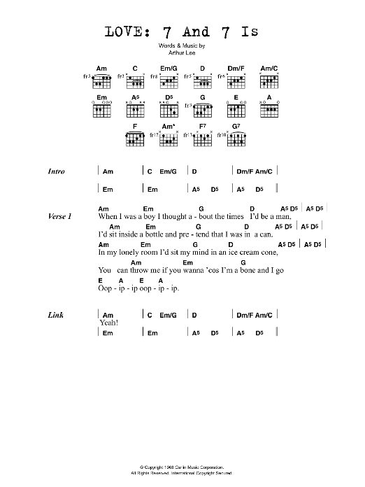 This composition is beautifuly arranged for Lyrics & Chords includes 2 page(s). It is performed by Love. The style of the score is 'Rock'. Catalog SKU number of the notation is 43750.
