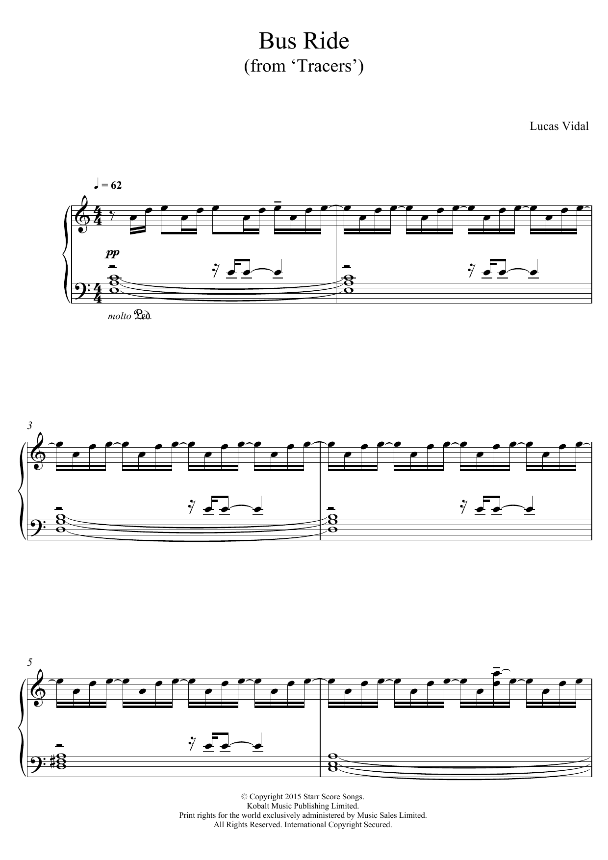 Download or print Lucas Vidal Bus Ride (from 'Tracers') sheet music, chords and digital score arranged for Piano Solo. This Film/TV score includes 2 page(s).